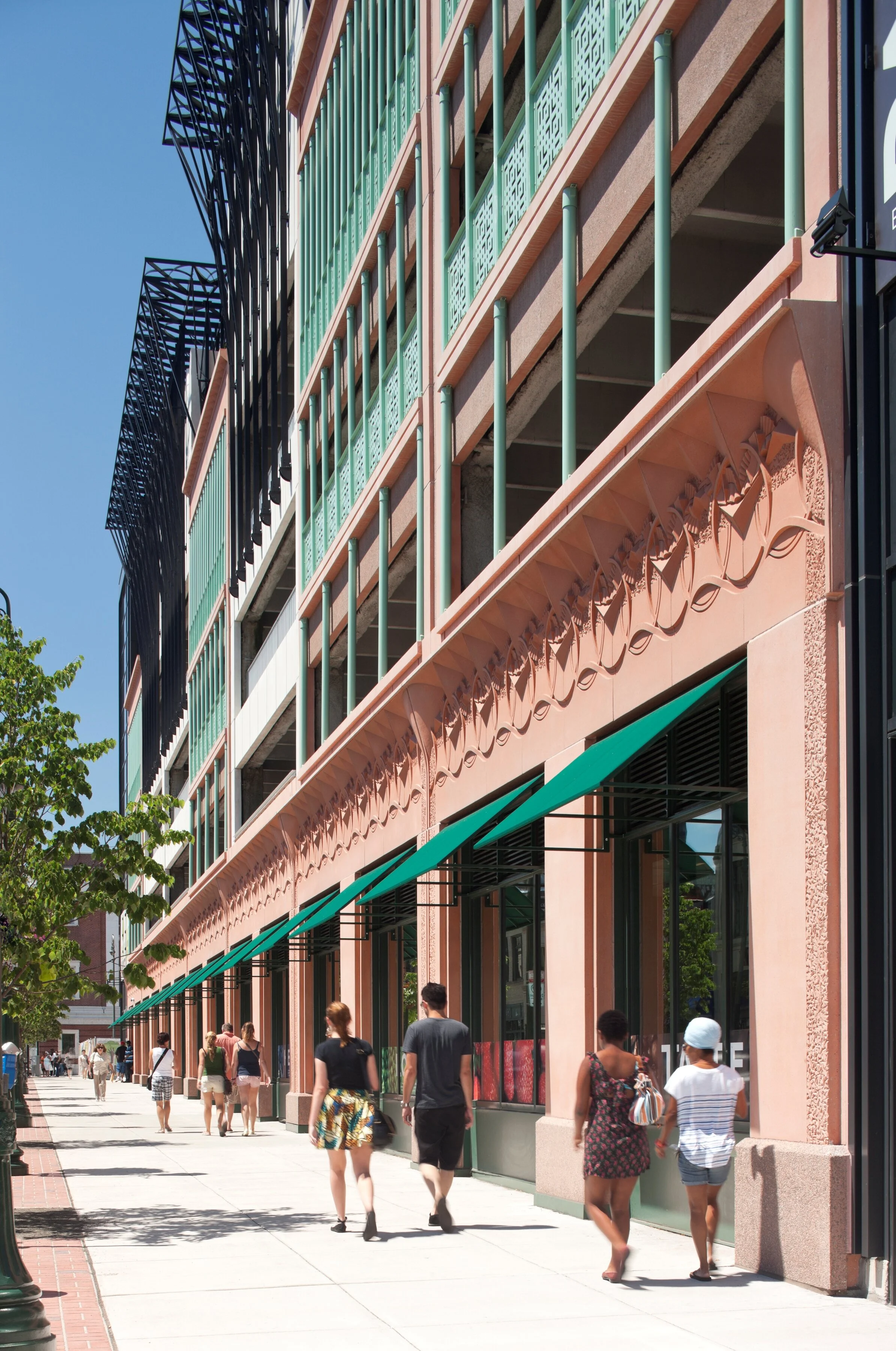500 apartments (including 50 affordable units), Elm City Market cooperative grocery store, Devil's Gear bike shop, parking garage, green roof with swimming pool, library, fitness center, art gallery, club rooms, and guest suites.